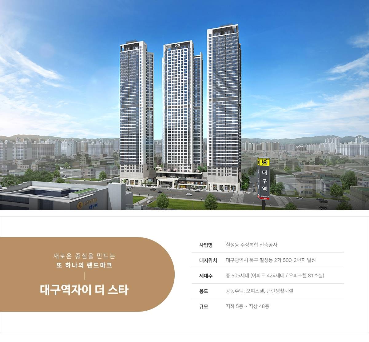 아파트 424세대와 오피스텔 81실로 구성된 최고 47층 높이의 주거 복합 단지로 대구 도심을 내려다보는 탁월한 조망과 상징성을 갖추었습니다.